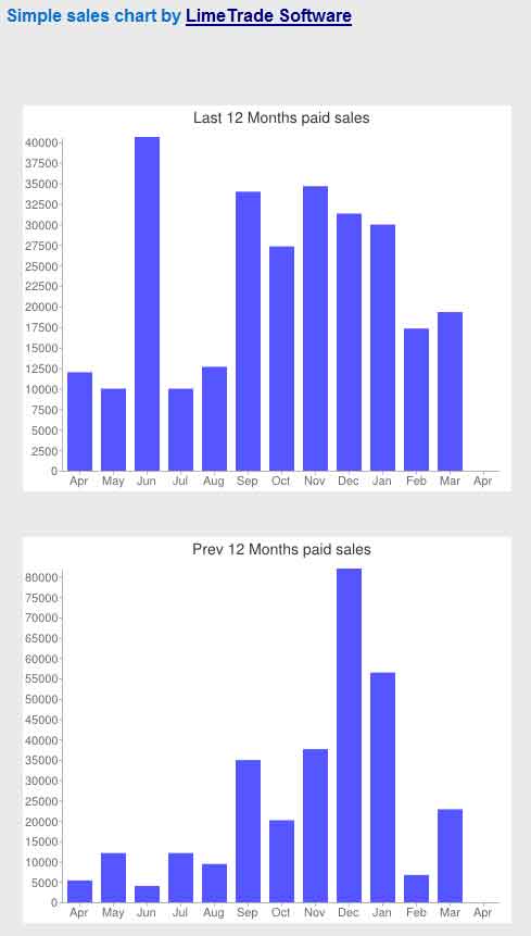 These simple sales stats provide a month by month comparison of sales from the last 12 months as compared to the previous 12 months...